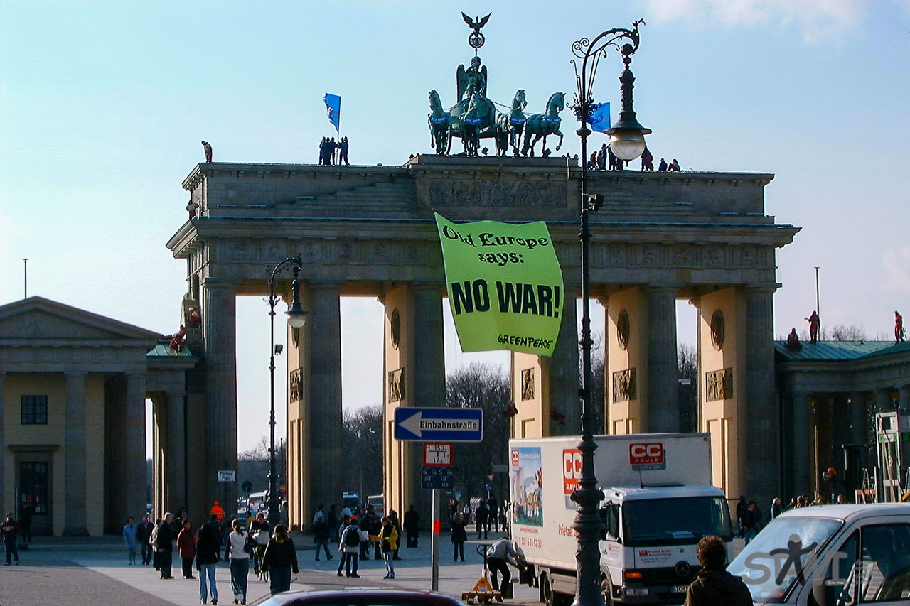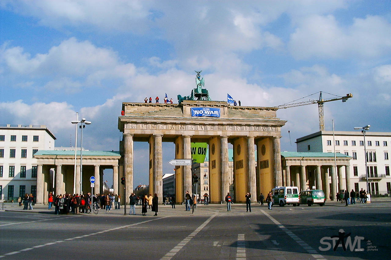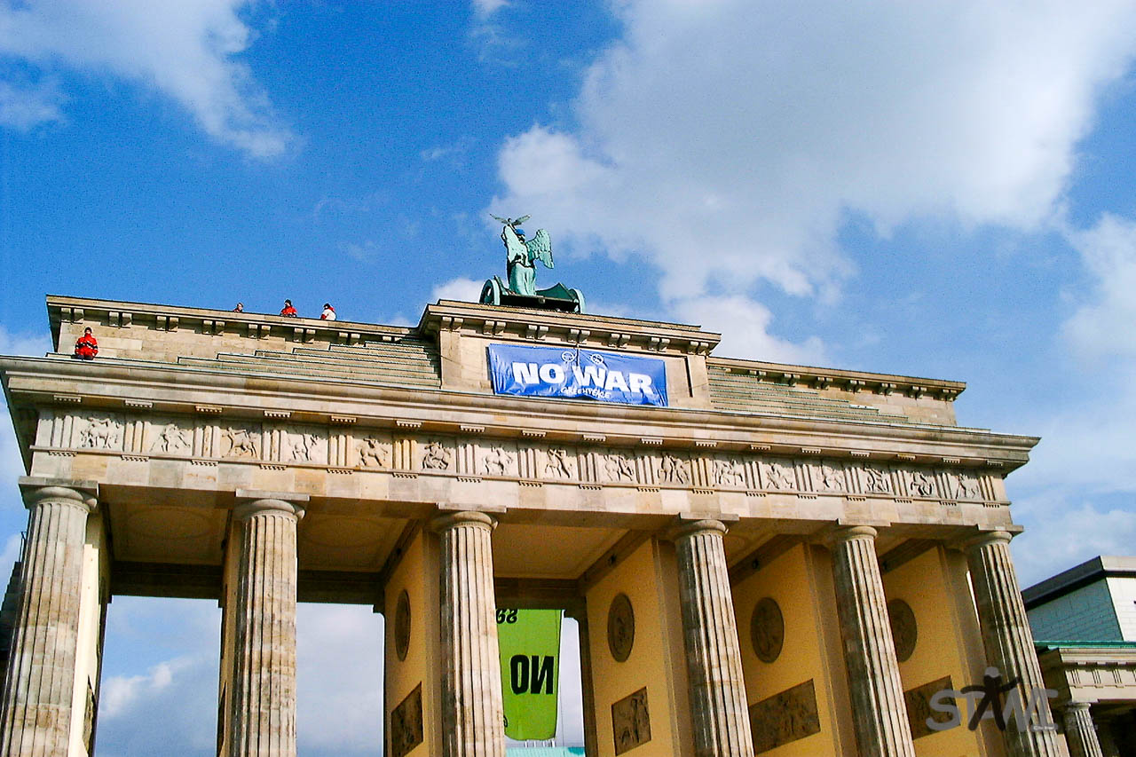Bei der Anfahrt auf das Brandenburger Tor, fiel mir schon auf das etwas anders ist als sonst. Abgesehen davon, das dort immer irgendetwas ist. Des Rätsellösung, genau an diesem Tag hatten Greenpeace-Aktivisten das Brandenburger Tor geentert und zwei riesigen Banner gegen den Krieg im Irak gehisst.