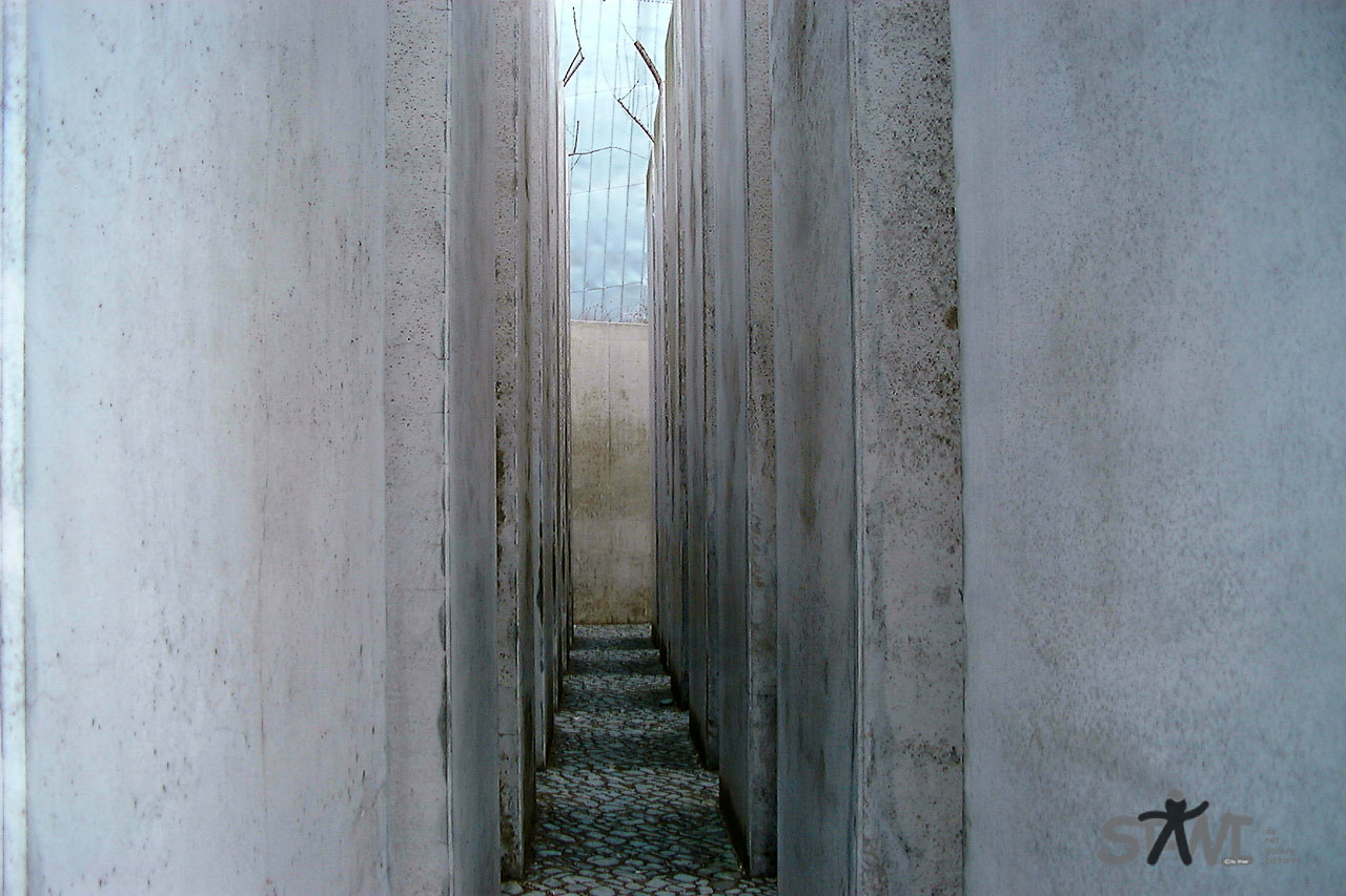 „Eine schwere Stahltür öffnet den Weg in den Holocaust-Turm. Dieser Turm ist nur unterirdisch betretbar und besteht – wie alle Leerräume – aus Beton. Er ist weder beheizt noch isoliert, so dass es hier selbst im Sommer kühl und feucht ist. Licht fällt nur tagsüber durch einen hohen, schmalen Fensterschlitz herein. Die Straßengeräusche sind im Turm deutlich zu hören, doch die Außenwelt ist unerreichbar.“